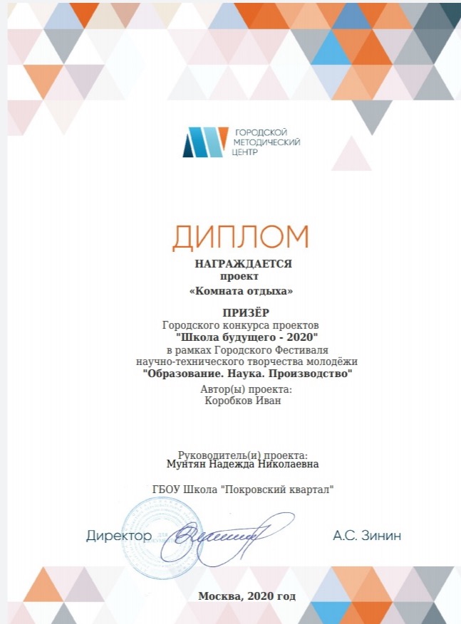 Коробков Иван, ученик 1 "Ч" класса, стал призером городского конкурса проектов "Школа будущего- 2020" в рамках Городского фестиваля научно- технического творчества молодежи "Образование. Наука. Производство". Тема проекта: "Комната отдыха". Руководитель проекта: Мунтян Надежда Николаевна.