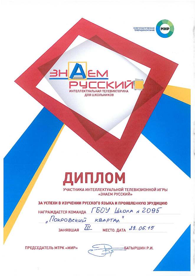 22 мая 2015 года восьмиклассники структурного подразделения №1397 приняли участие в программе телекомпании "Мир". С успехом выступив в интеллектуальной викторине, ребята завоевали почетное III место.