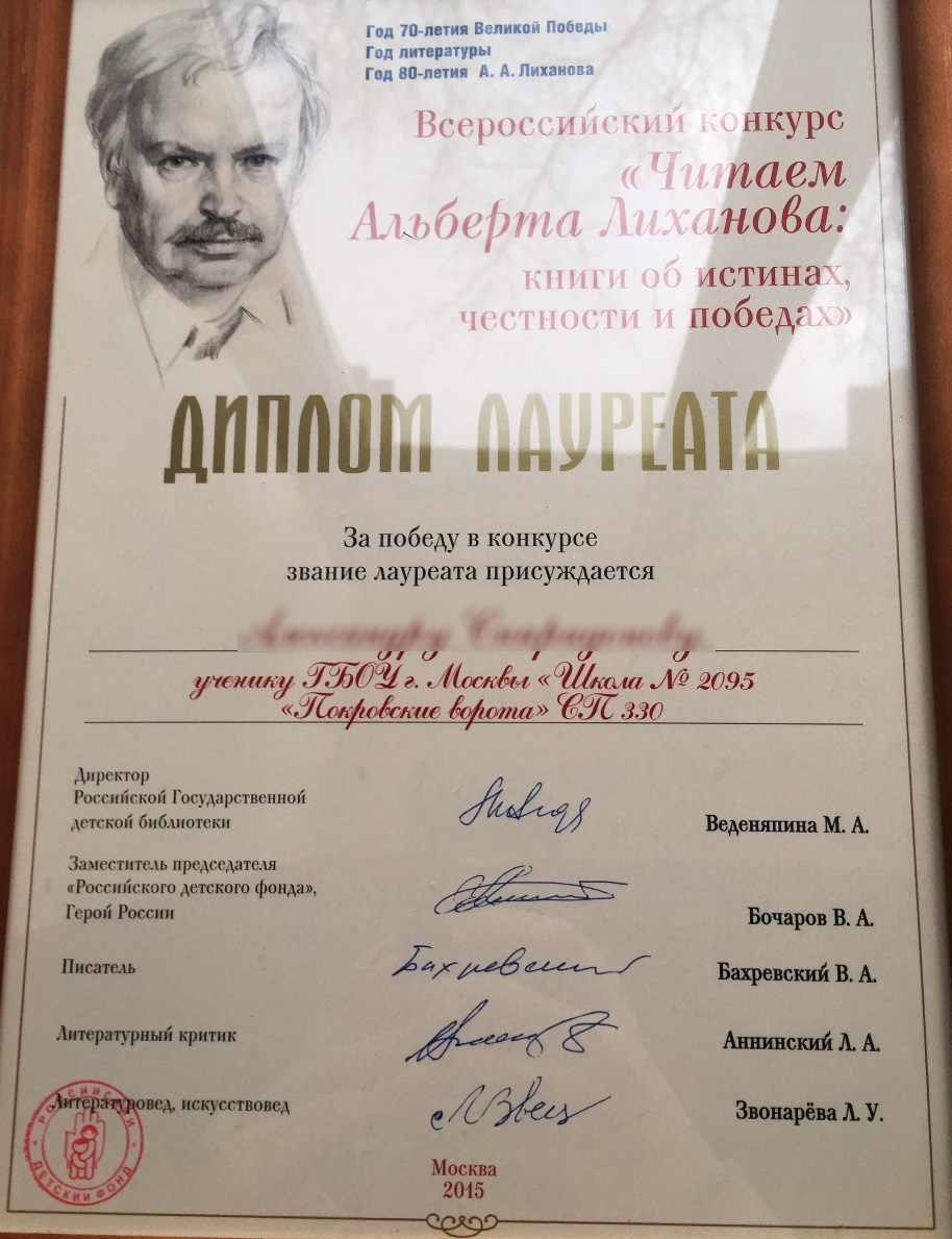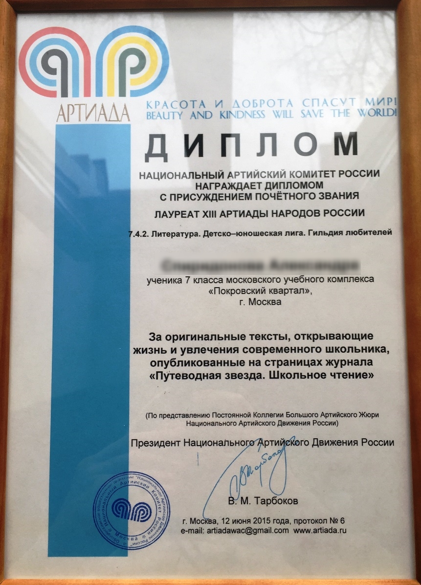 Учащийся нашей Школы Александр С. награжден дипломом лауреата за победу во всероссийском конкурсе "Читаем Альберта Лиханова: книги об истинах, честности и победах" и дипломом национального артийского комитета России в номинации "Литература. Детско-юношеская лига". Оригинальные тексты нашего ученика, открывающие жизнь и увлечения современного школьника опубликованы на страницах журнала "Путеводная звезда. Школьное чтение". Подготовиться к конкурсам Александру помогал Ананичев А.С., руководитель литературного клуба Школы.